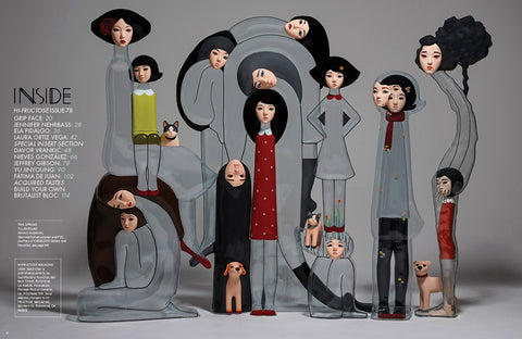 The 77th Issue of Hi-Fructose features a feature on Nieves Gonzalez, the art of Grip Face, The landscapes of Jennifer Nehrbass, the soft sculptures of Ela Fidalgo, the stitched urban landscapes of Laura Ortiz Vega, the art Jeffrey Gibson, Yu Jin Young's once transparent figures, and the paintings of Fatima De Juan. Plus a Special Insert Section focused on the drawings of Davor Vrankic, Build Your own Brutalist Bloc, and more!